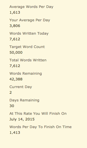 Looking forward — all the way to the end of the goal — is, well, kind of daunting. I know that the momentum of the first two days isn’t likely to continue throughout the month, but it is still a really good start. I like this idea and the way it is forming; I like the characters that are emerging. I feel good about this project.
